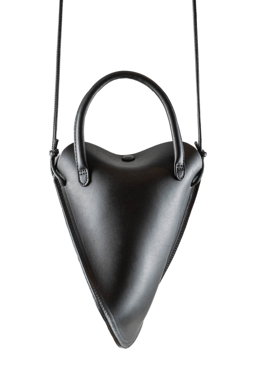 • This unique shoulder bag is made by sewing two identical pieces cut diagonally, one at a time and offsetting the front from the other, to create a twisted, three-dimensional effect